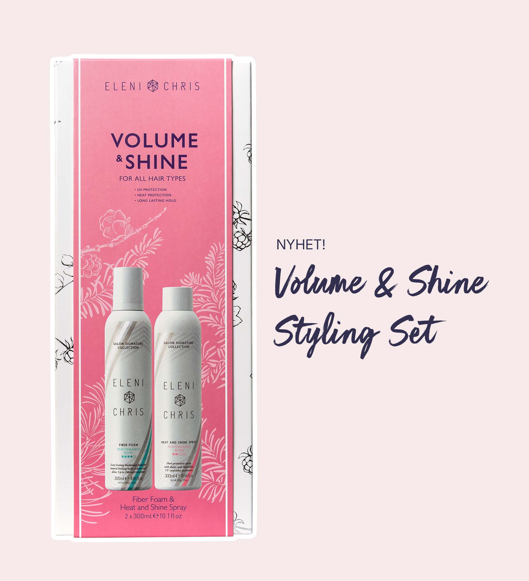 Nyhet i år: Volume & Shine Styling Set. Innehåller stylingfavoriterna Fiber Foam och Heat & Shine Spray. Det perfekta presentsetet för en vän, syster eller partner.